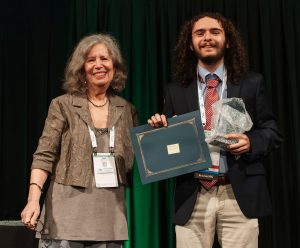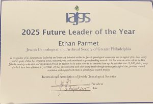 Jane Berenbeim with Ethan Parmet receiving his IAJGS Award in Fort Wayne, Indiana at the 2025 IAJGS Conference. |